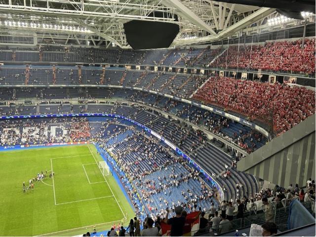 自当地时间中午起,马德里的地标建筑太阳门广场上就聚集了数千名柏林联盟远征球迷,他们前赴后继涌向新伯纳乌球场,集体高举手臂放声歌唱。一位柏林联盟死忠接受笔者采访时表示,柏林联盟这支平民球队不似皇马、拜仁这般巨星云集,但他们作为人民的球队,足以与最强大的力量抗衡。